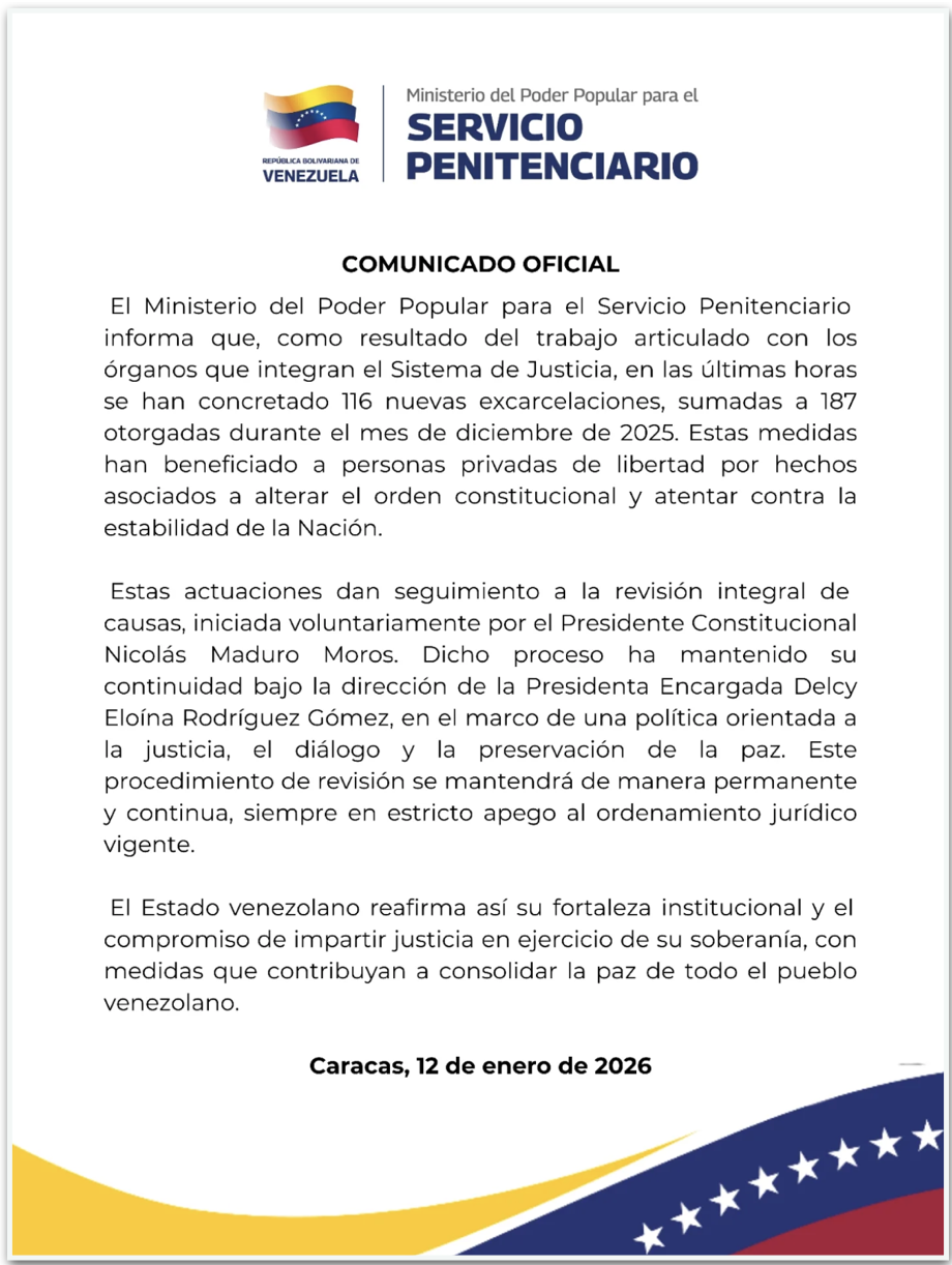 Согласно заявлению Министерства пенитенциарных служб Венесуэлы, 116 освобождений, объявленных правительством, являются дополнением к еще 187 освобождениям, осуществленным в декабре. Агентство заявило, что релизы принесли пользу «лица, лишенные свободы за действия, нарушающие конституционный порядок и подрывающие стабильность нации».