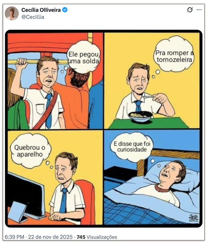 «Центр интеграции комплексного мониторинга Федерального округа сообщил Верховному суду о факте нарушения оборудования электронного мониторинга обвиняемого Жаира Мессиаса Болсонару в 0:08 22 ноября 2025 года. Информация подтверждает намерение осужденного сломать электронный браслет на лодыжке, чтобы обеспечить успех в его побеге, чему способствовала неразбериха, вызванная демонстрацией, созванной его сыном»— говорится в приказе министра СТФ.