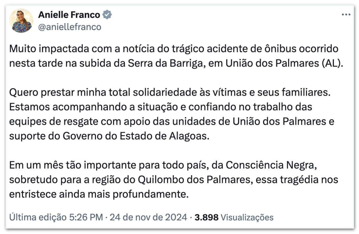 Министр расового равенства Аниэль Франко заявила, что она «очень повлияло» с известием о происшествии. «В такой важный месяц для всей страны, для «Черного сознания», особенно для региона Киломбо-дус-Пальмарес, эта трагедия огорчает нас еще сильнее»заявил в своем профиле на X.