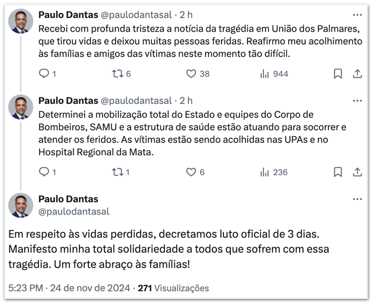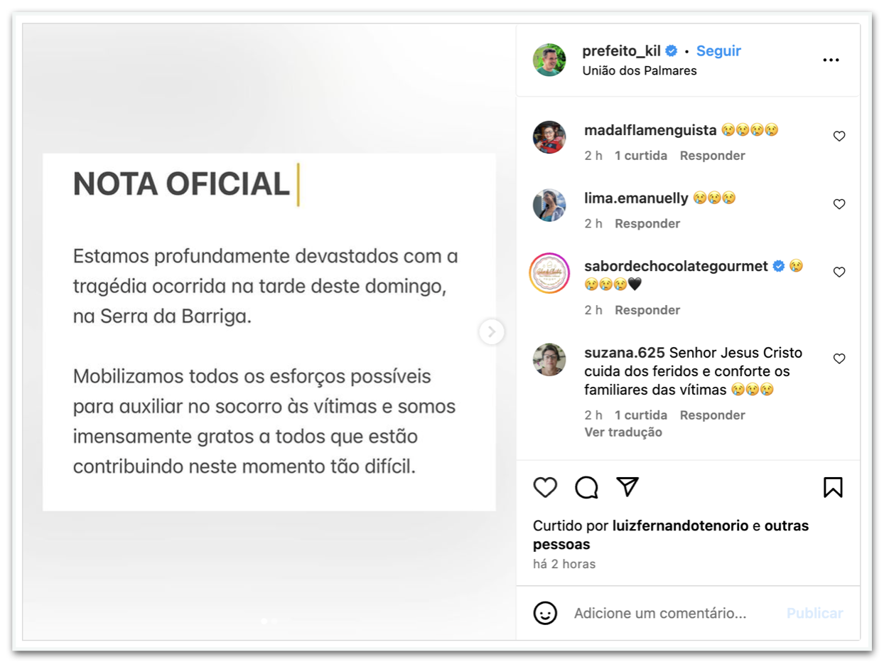 Мэр Униан-дус-Палмарес Арески Фрейтас Жуниор (MDB) также объявил трехдневный официальный траур. Он заявил, что обстоятельства происшествия выясняются, и выразил солидарность с пострадавшими.