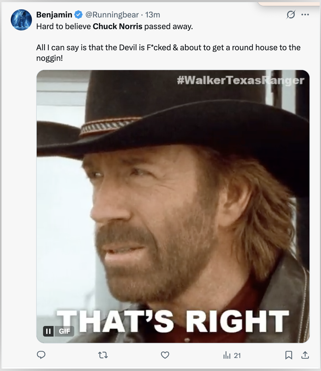«Трудно поверить, что Чак Норрис скончался. Все, что я могу сказать, это то, что Дьявол облажался и вот-вот получит удар по голове!», — написал один интернет-пользователь.
