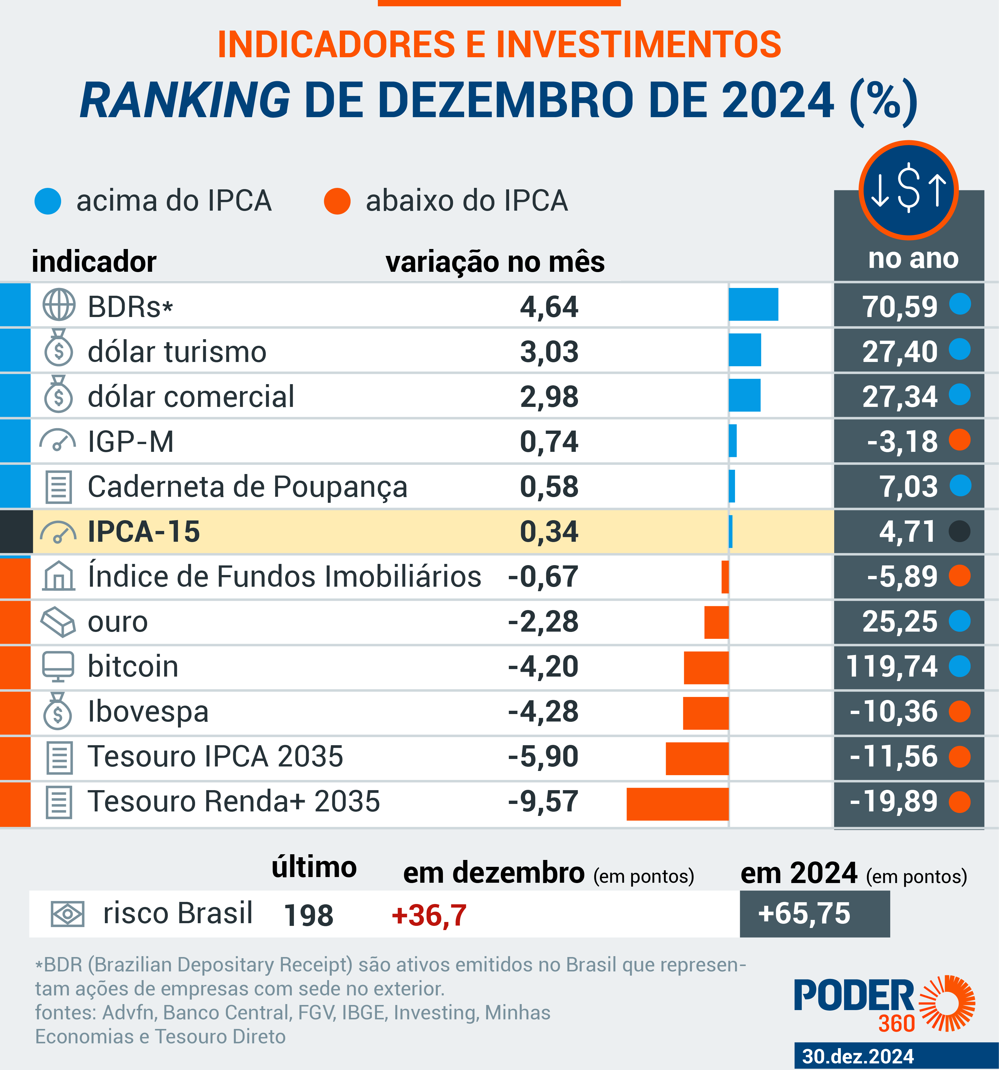 Что касается снижения, индекс Ifix (индекс фонда недвижимости) упал на 5,9% за год. Государственные казначейские облигации (IPCA+ и Renda+ со сроком погашения в 2035 году) также были в минусе.