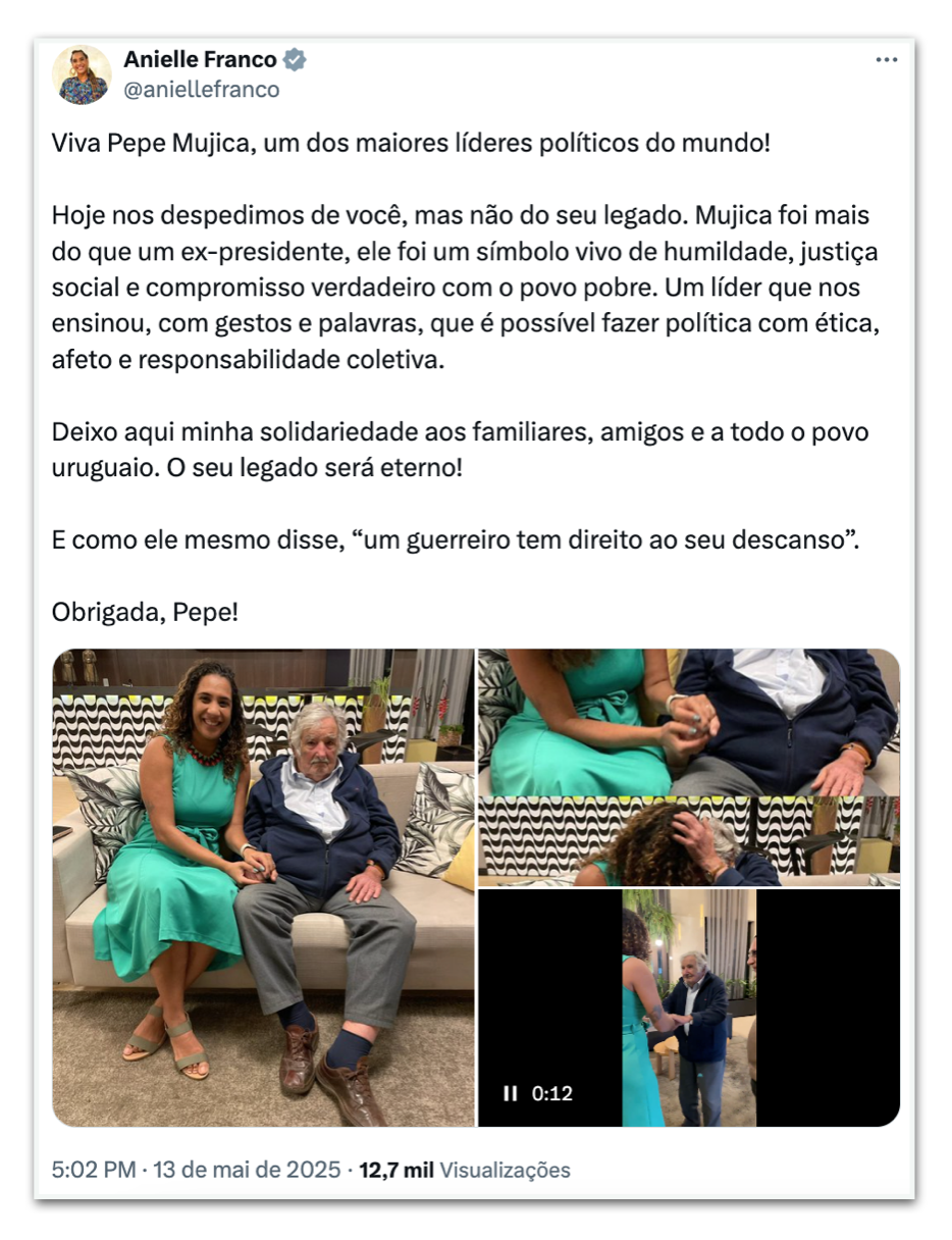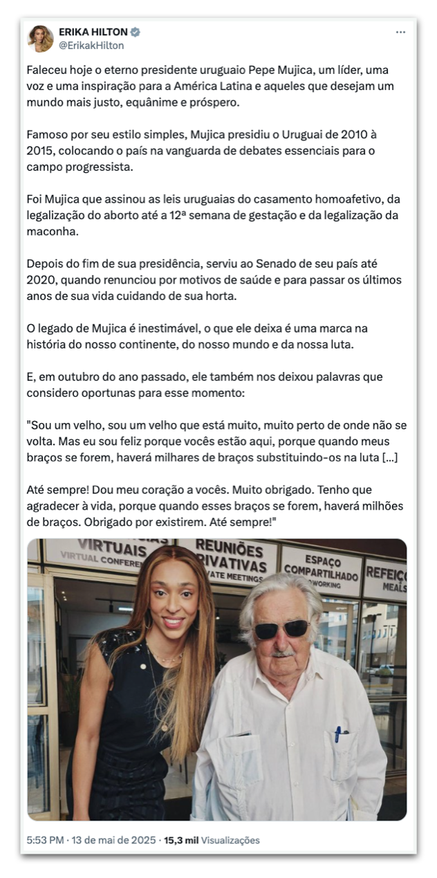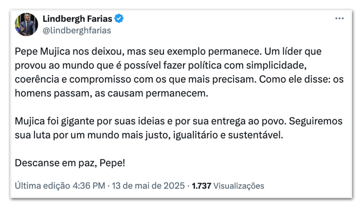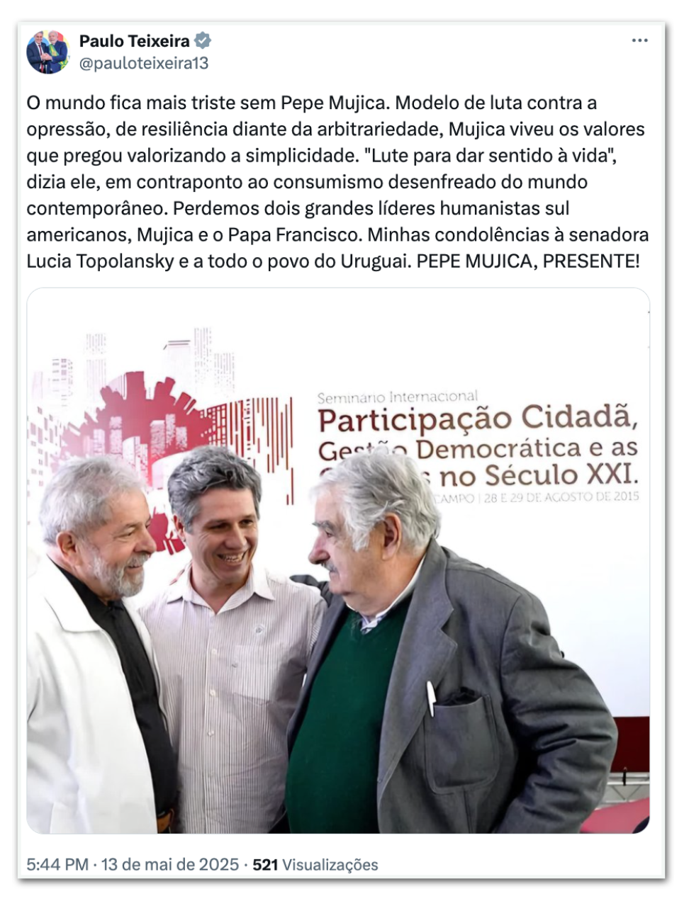 Бразильские политики оплакивали смерть бывшего президента Уругвайя Хосе «Пепе» Муджики, который умер 3 -го (13 мая 2025 года), в возрасте 89 лет. У него был рак пищевода. Смерть была подтверждена президентом Яманду Орси (фронт Ampla, в центре слева).