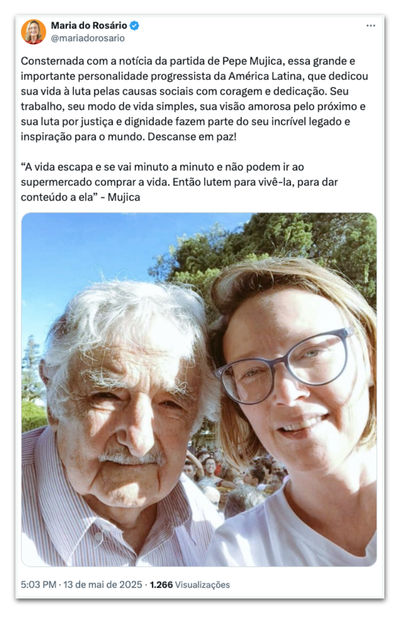 Министр Шри (Секретариат институциональных отношений), Глейси Хоффманн (PT), оплакивала смерть в своем официальном профиле в X и сказала, что Пепе Муджика была «Один из тех важных людей для человечества».