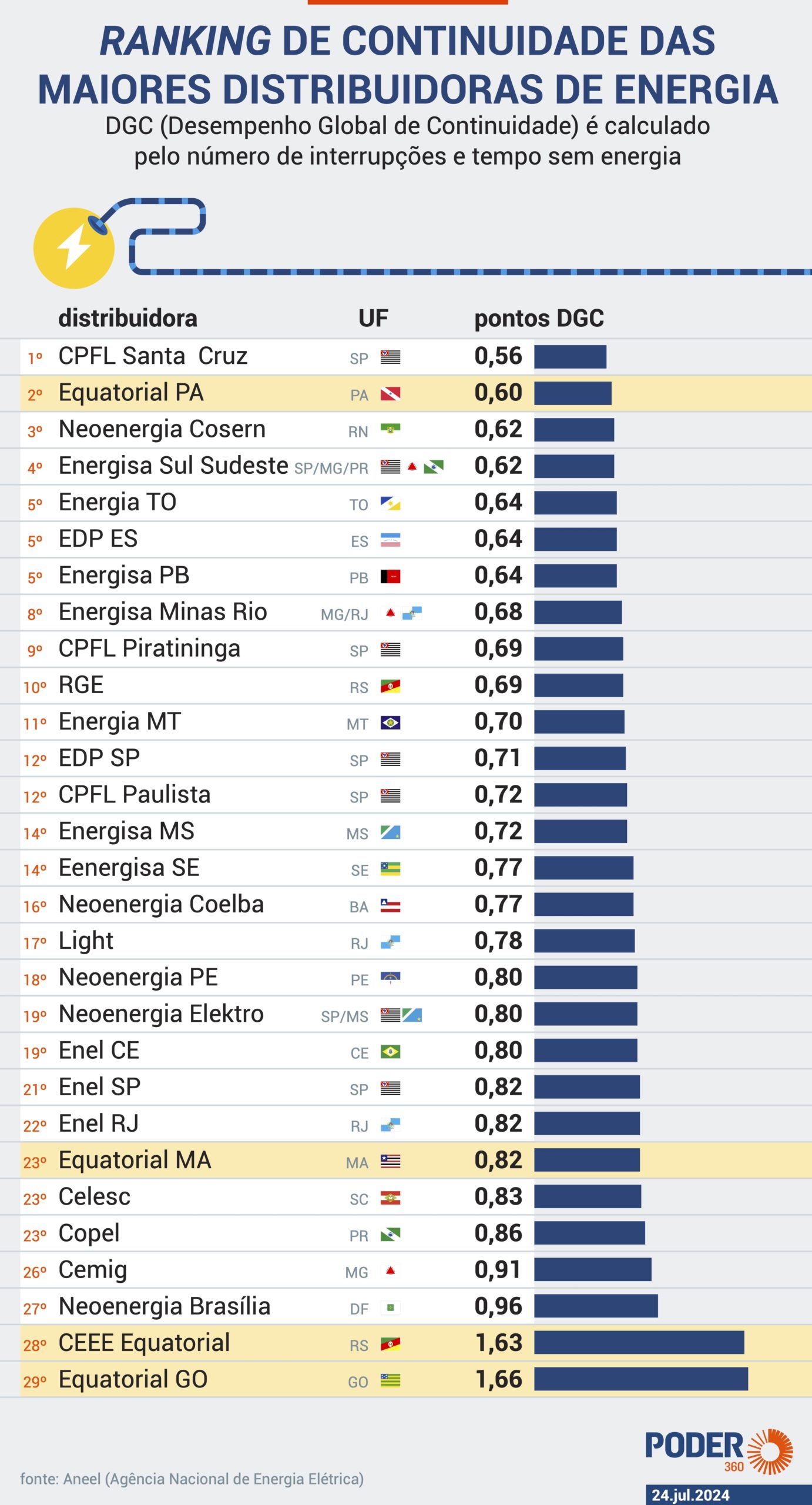 С другой стороны, концессия Экваториальной группы в Пара занимает второе место по показателям непрерывности в стране. Оно проигрывает только КПФЛ Санта-Крускомпания, которая снабжает регион Жагуариуна (СП) и контролируется китайским гигантом Государственная сеть.