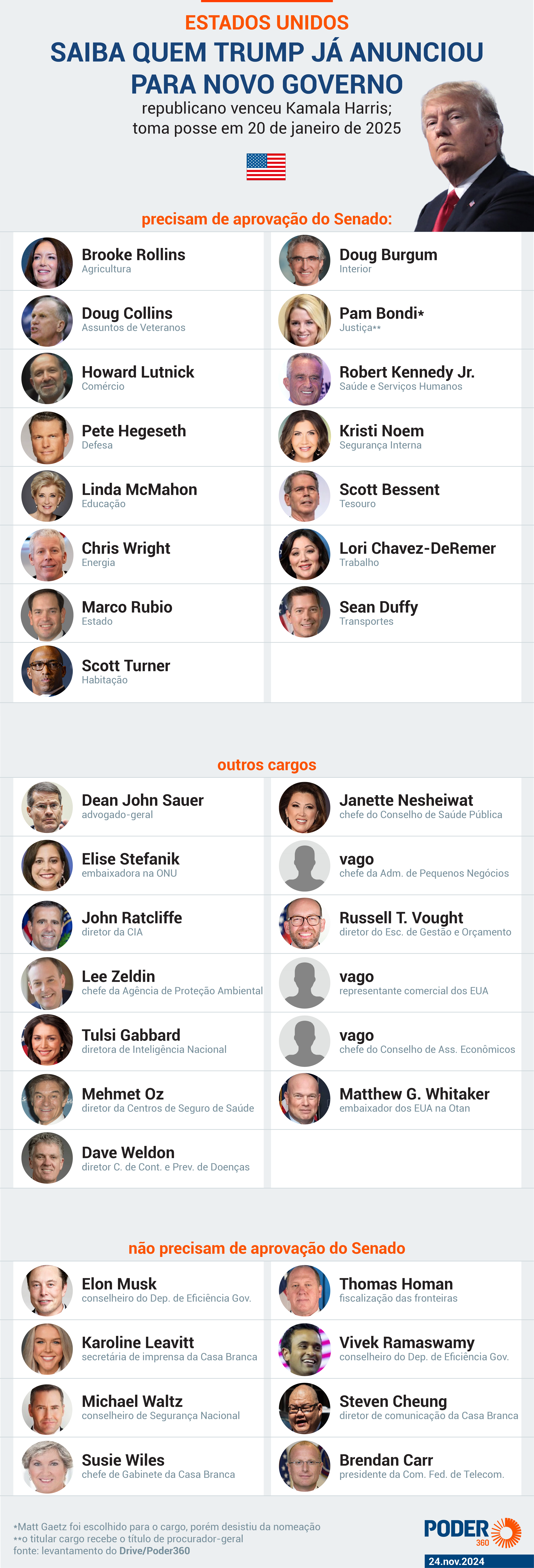 Помимо ведомств, которые в Бразилии эквивалентны министерствам, республиканец также объявил названия органов управления и должности в своем правительстве. Самым громким делом стало назначение миллиардера Илон Маск для Департамента эффективности правительства, которого не существовало в предыдущих правительствах.