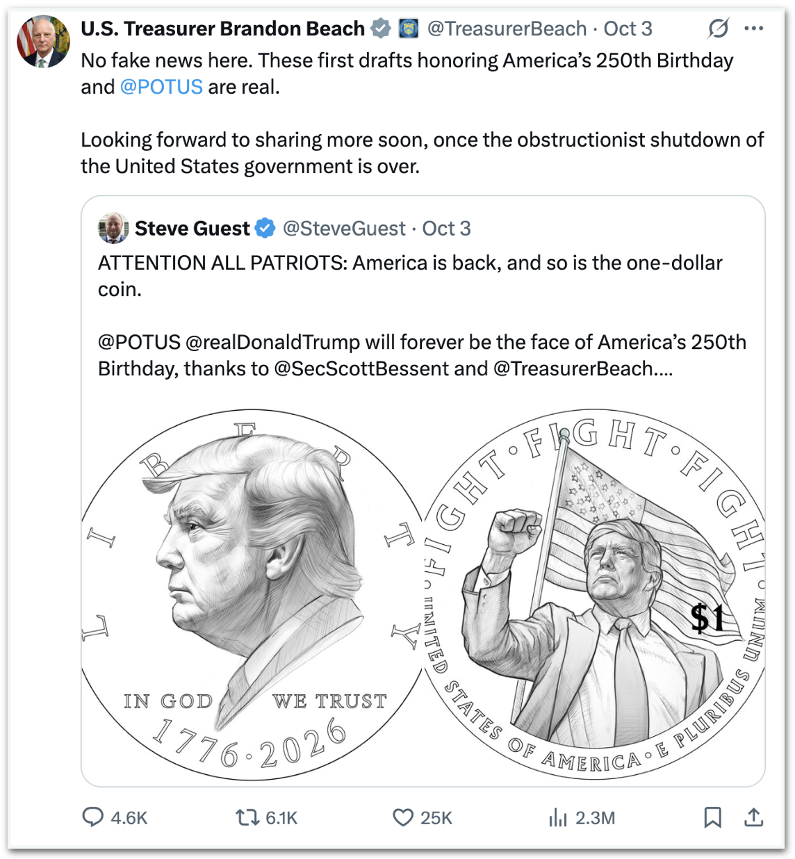 «Никаких фальшивых новостей здесь. Эти первые проекты в честь 250 -летия Америки и президента Трампа реальны. С нетерпением жду возможности поделиться большим количеством в ближайшее время, как только прекращается правительство Соединенных Штатов».написал пляж.