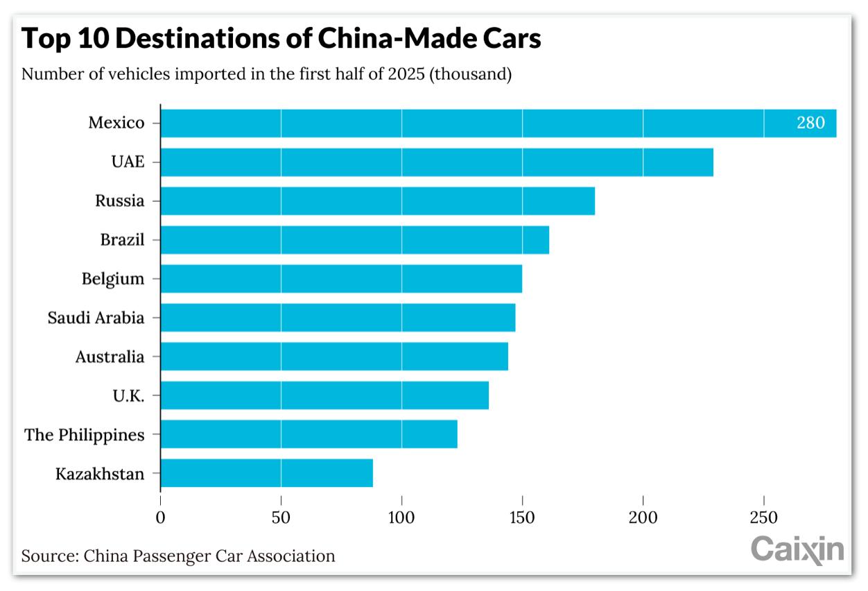 Согласно данным, составленным Cui Dongshu, генеральным секретарем CPCA (китайская ассоциация пассажирских автомобилей), Мексика была основным направлением для китайского экспорта транспортных средств в 1 -м семестре, за которым следуют Объединенные Арабские Эмираты, Россия, Бразилия и Бельгия.