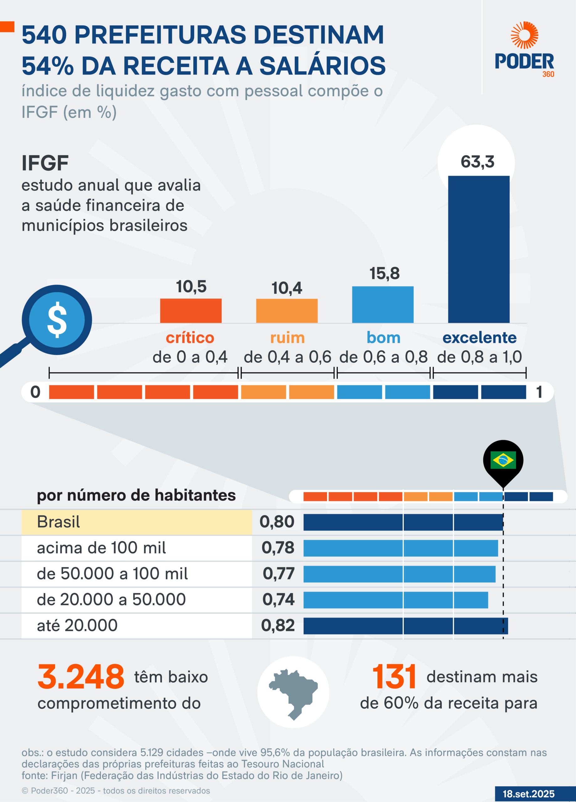 IFGF (индекс фискального управления Firjan) был создан для оценки государственных отчетов о бразильских муниципалитетах Федерацией промышленности штата Рио -де -Жанейро. В этом издании фискальный персонал был проанализирован с 2024 года. Он принял во внимание данные о 5129 муниципалитетах, которые передавали необходимые отчеты в Национальную казначейство.