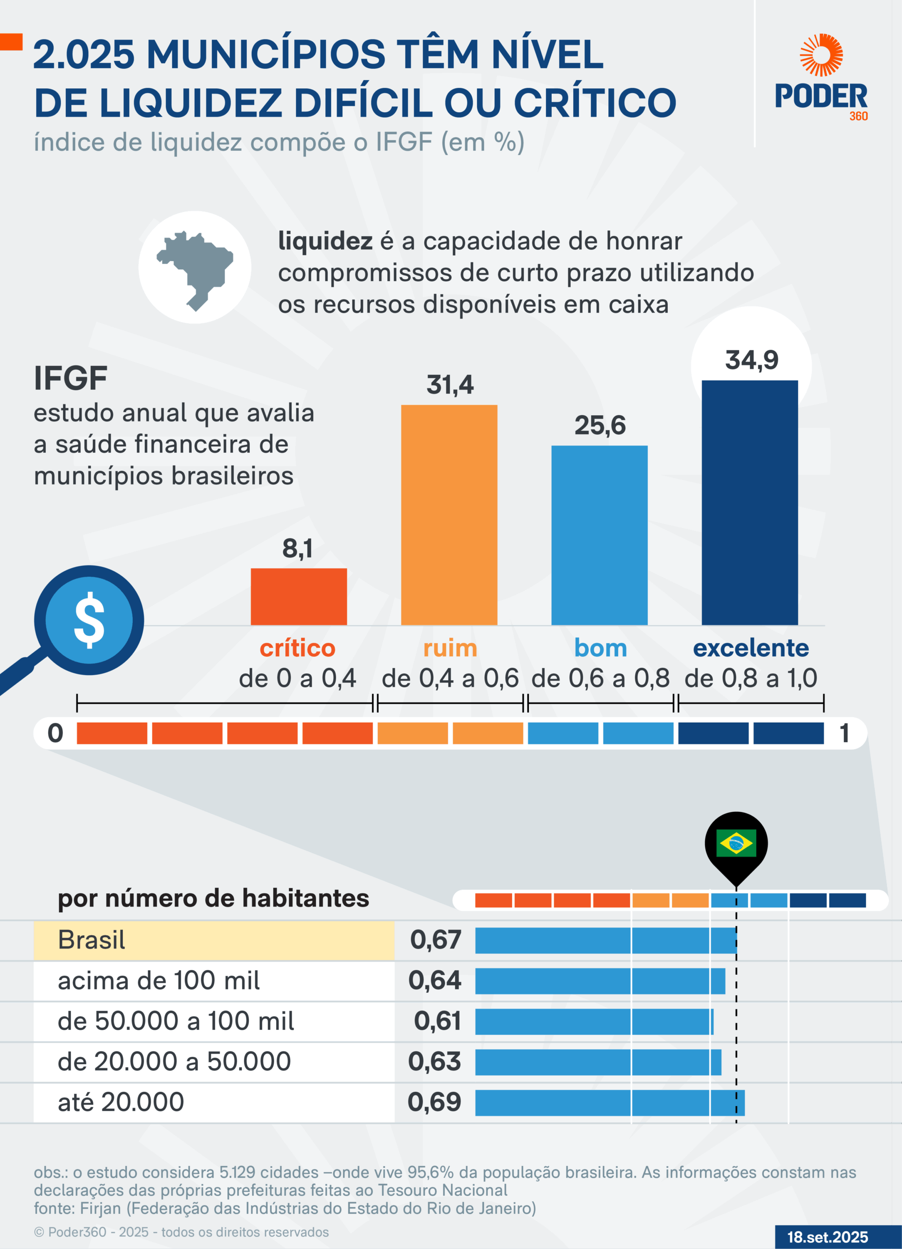 Средняя оценка составила 0,67 пункта. Большинство (60%) городов имели хороший или отличный уровень ликвидности. Исследование подсчитано, что в 2024 году у 2 025 муниципалитетов было трудный или критический уровень ликвидности. В этом числе 413, которые закончились год без достаточных денежных ресурсов для покрытия расходов на почту на следующий год. Они взяли ноль.