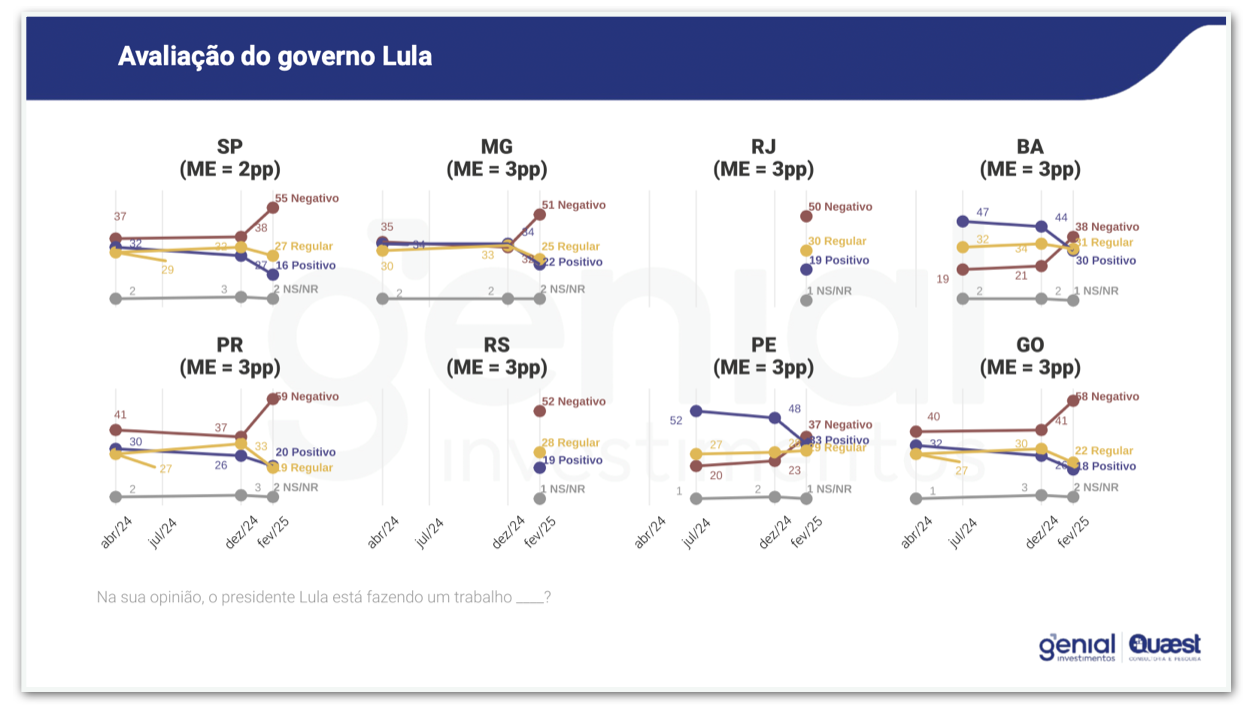 Согласно опросу, администрация Лулы потерпела неудачу в течение 50% или более избирателей в 8 опрошенных штатах. Неодобрение превышает 60% в Сан -Паулу, Рио -де -Жанейро и Минас Герайс.