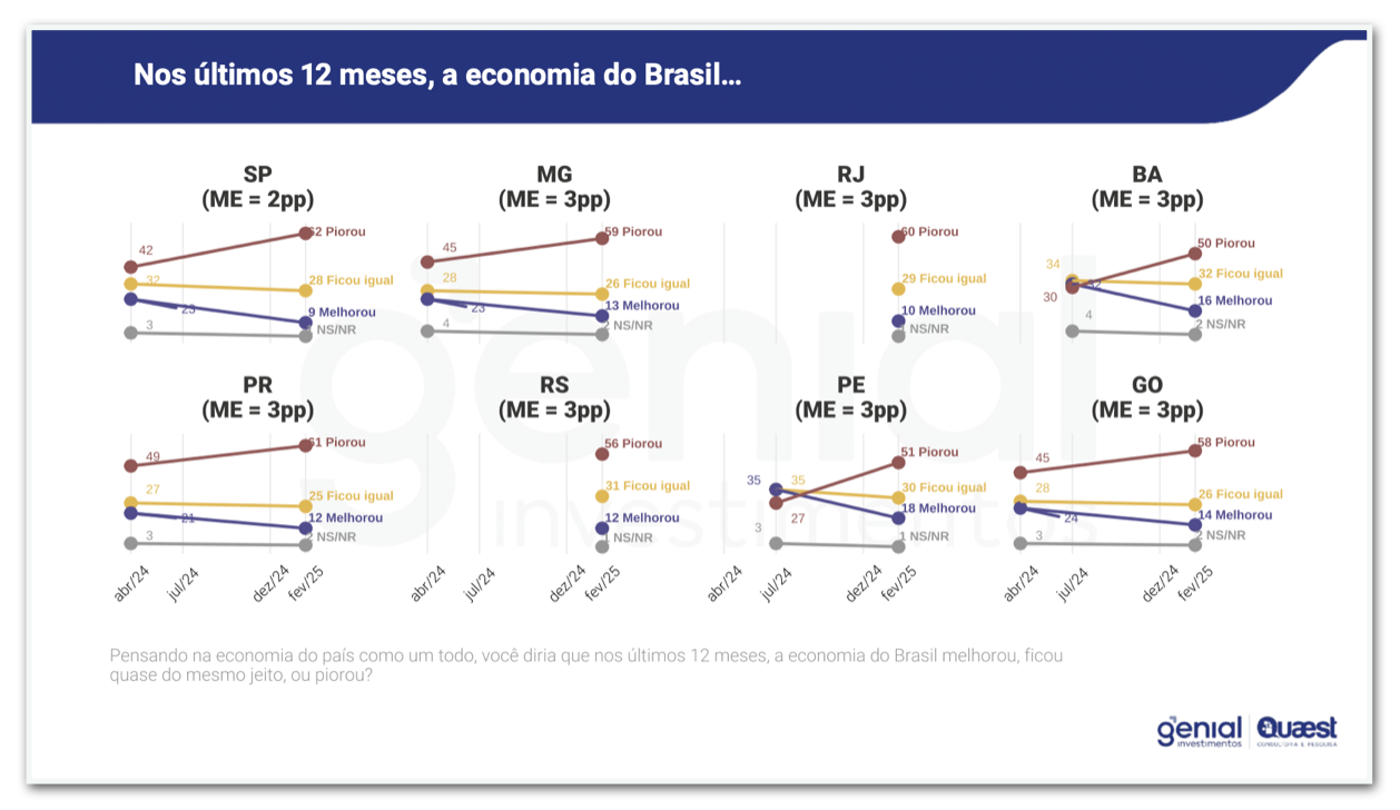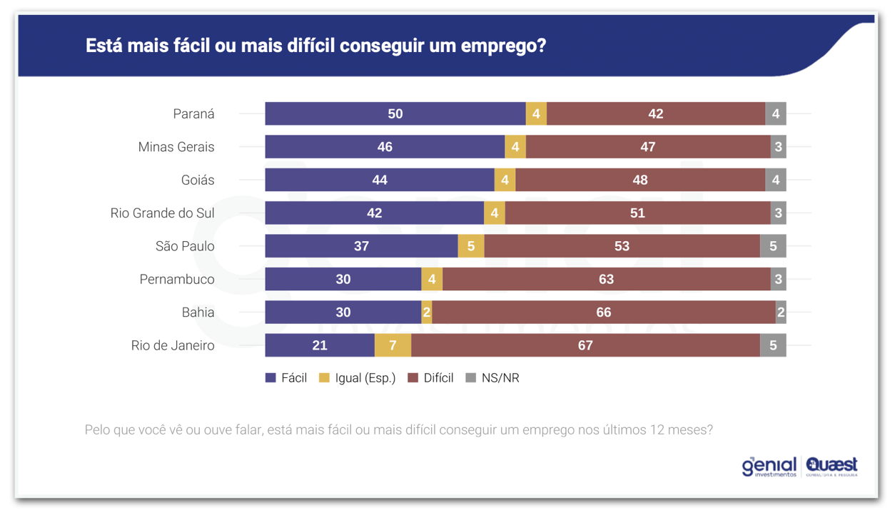 По словам Фелипе Нуньес, директора Quaest, «Это ухудшение, кажется, не происходит из -за безработицы »Полем Он сказал, что «Есть высокая корреляция«Между скоростью реального выселения и восприятием сложности получения работы. «В Рио -де -Жанейро и Баии, где выселение больше, все больше людей утверждают, что трудно найти работу. В Парана и Минас Герайс, где выселение ниже, восприятие сложности меньше— сказал он.