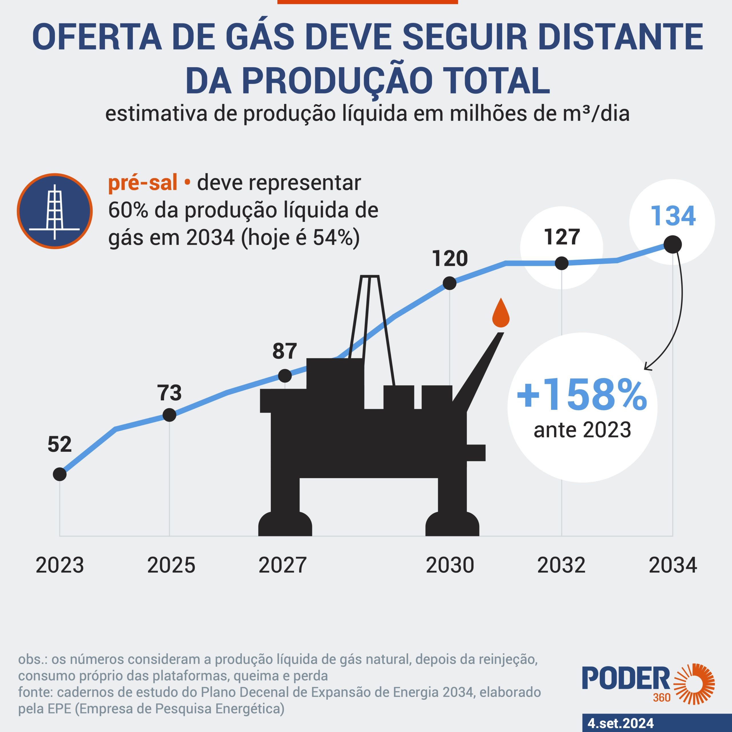По данным EPE, чистая добыча природного газа, то есть того, что фактически предлагается рынку, должна вырасти с 52 млн м³/день до 134 млн м³ в 2034 году. В случае подтверждения это будет рост на 158%.