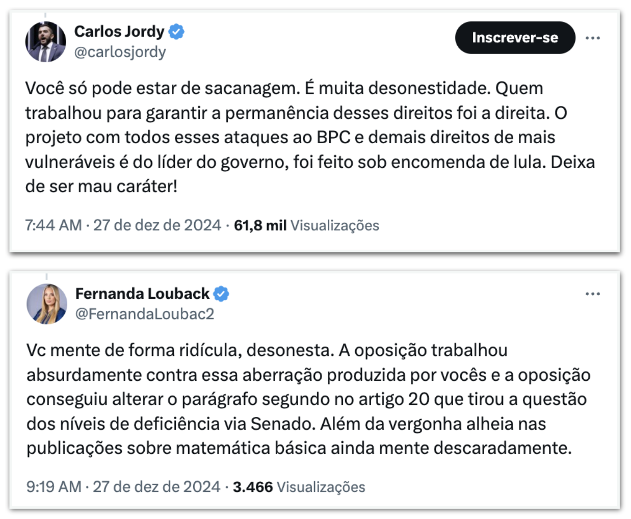 Публикация Руссефф получила контекстное предупреждение, добавленное пользователями X со ссылкой на ЛП на сайте Палаты и следующее сообщение: «Речь идет о фейковых новостей! Автор поста дезинформирует, сообщая ложные новости, как если бы они были правдой»..