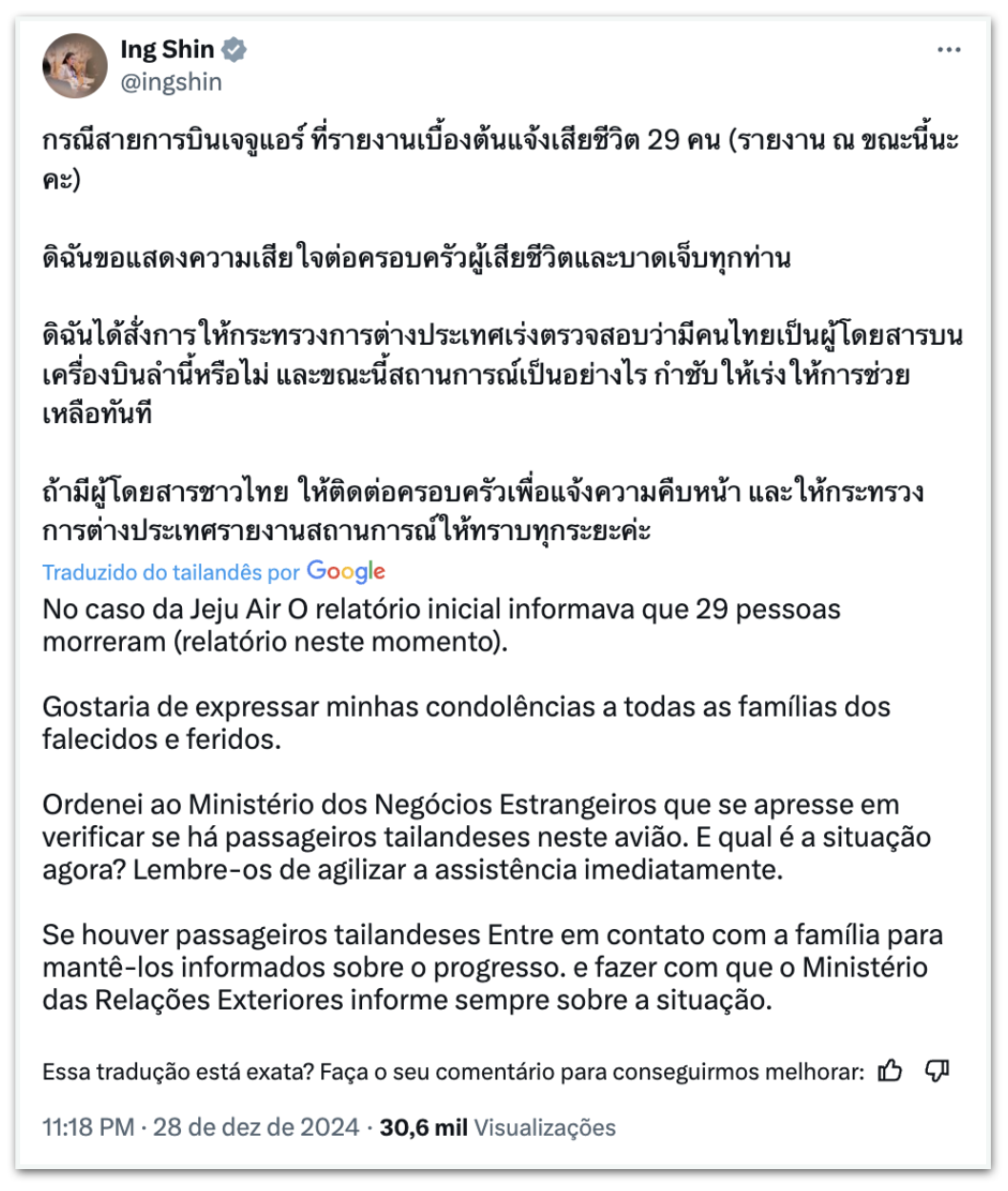 Премьер-министр Таиланда Паетонгтарн Чинават выразил сожаление по поводу аварии. В своем профиле на X он выразил соболезнования и заявил, что страна предложит помощь.