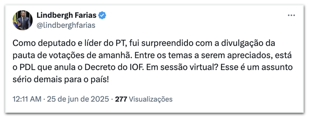 Мэр, Хьюго Мотта (республиканцы-PB), руководствуется этой средой (25. июня 2025 г.) голосование по проекту PDL (законодательный указ) 314 от 2025 года, который отменяет постановление правительства, которое увеличило IOF (налог на финансовые операции). Мотта объявил о повестке дня в своем профиле X в 23:35 в четверг (24. июня).
